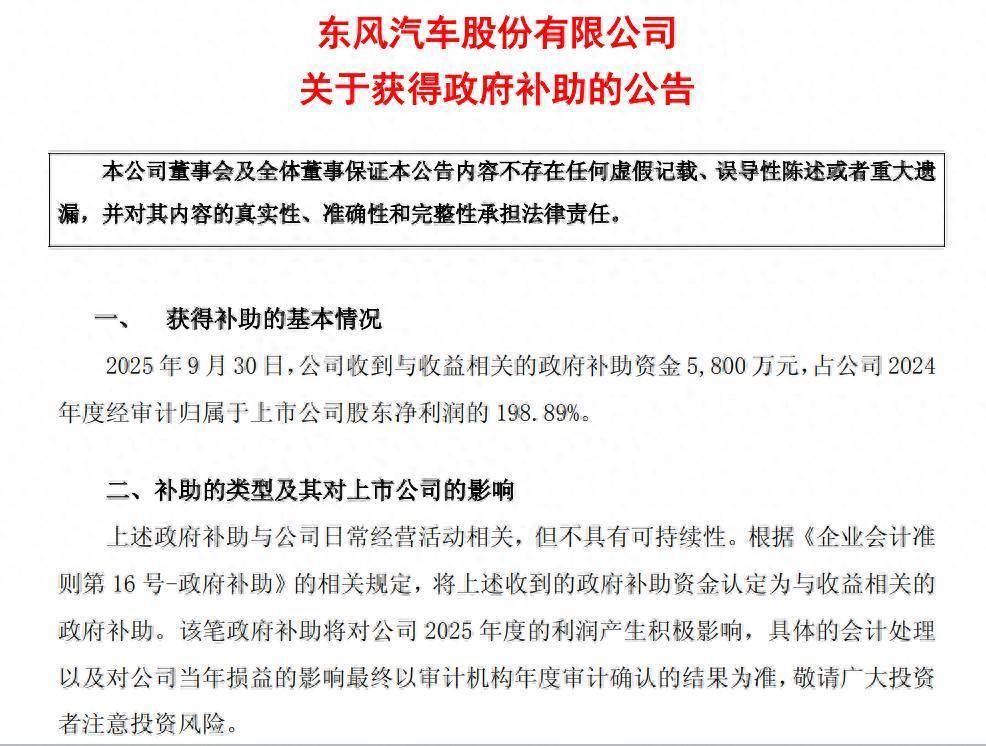 9月30日晚间,东风股份(600006)发布公告,9月30日,公司收到与收益相关的政府补助资金5,800万元,占公司2024年度经审计归属于上市公司股东净利润的198.89%。